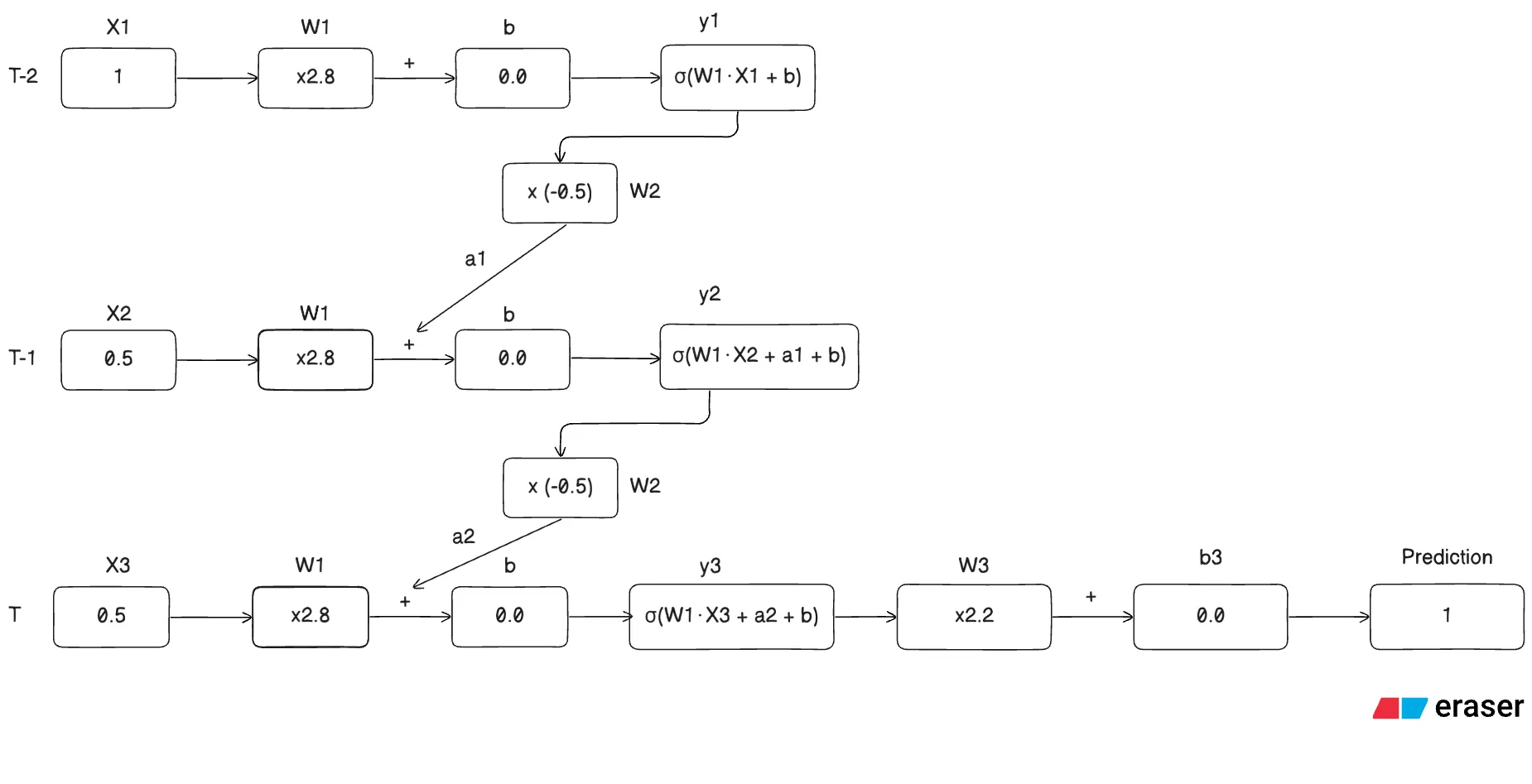 Note: The weights and biases for all the three timesteps are the same, this is the novelty of this network which helps carry over context to the next timestep