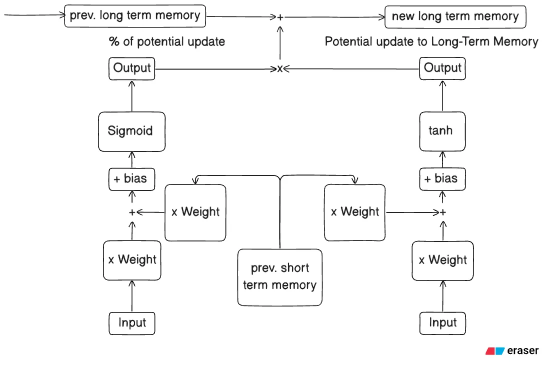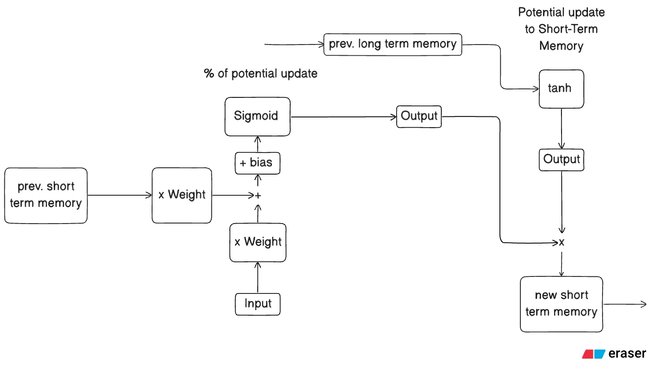 This cell is responsible for calculating the percentage of the potential memory to save or update the Long-Term Memory given a set of input, short-term memory, weight and bias.